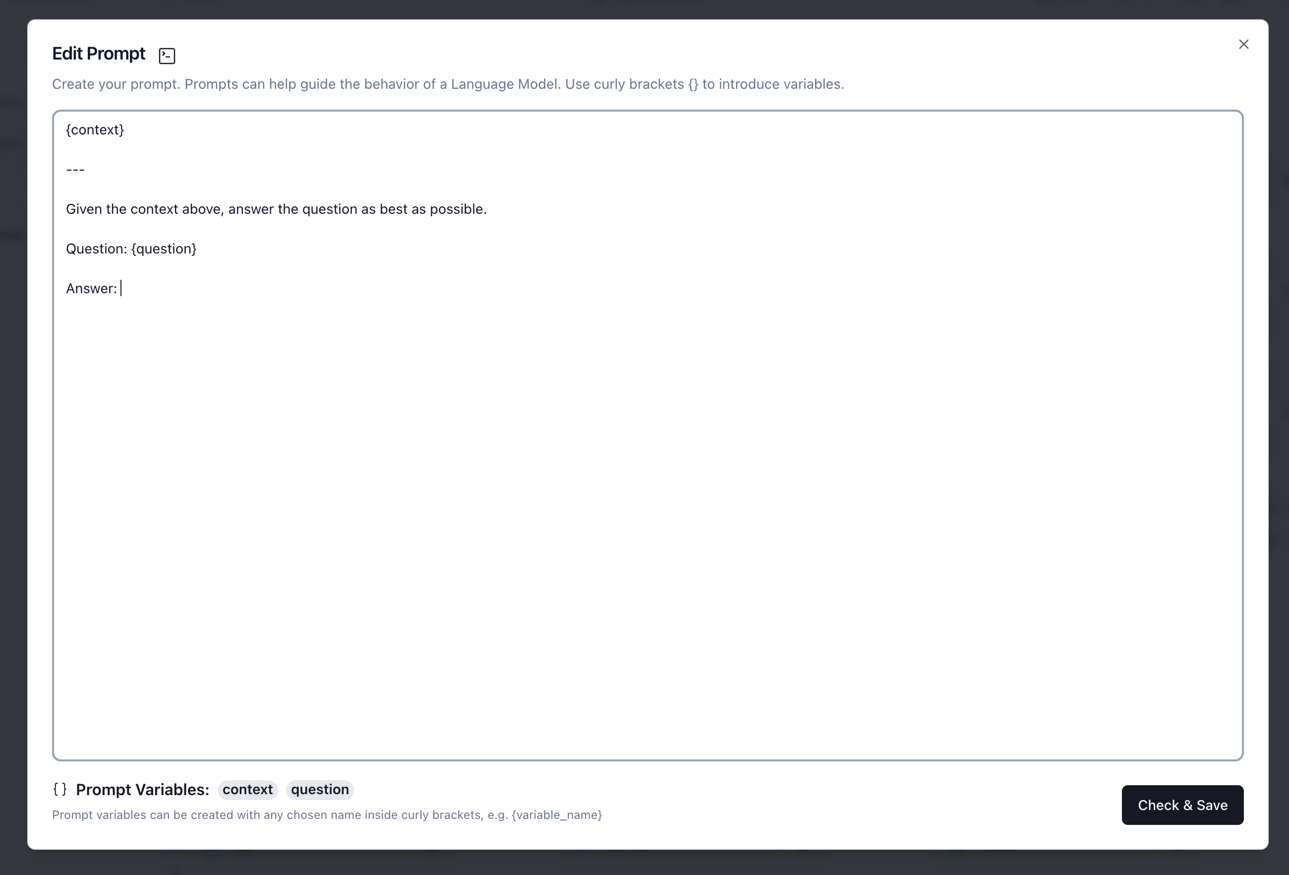 Create a "Prompt" component with a prompt that takes {context} and {question} as inputs.