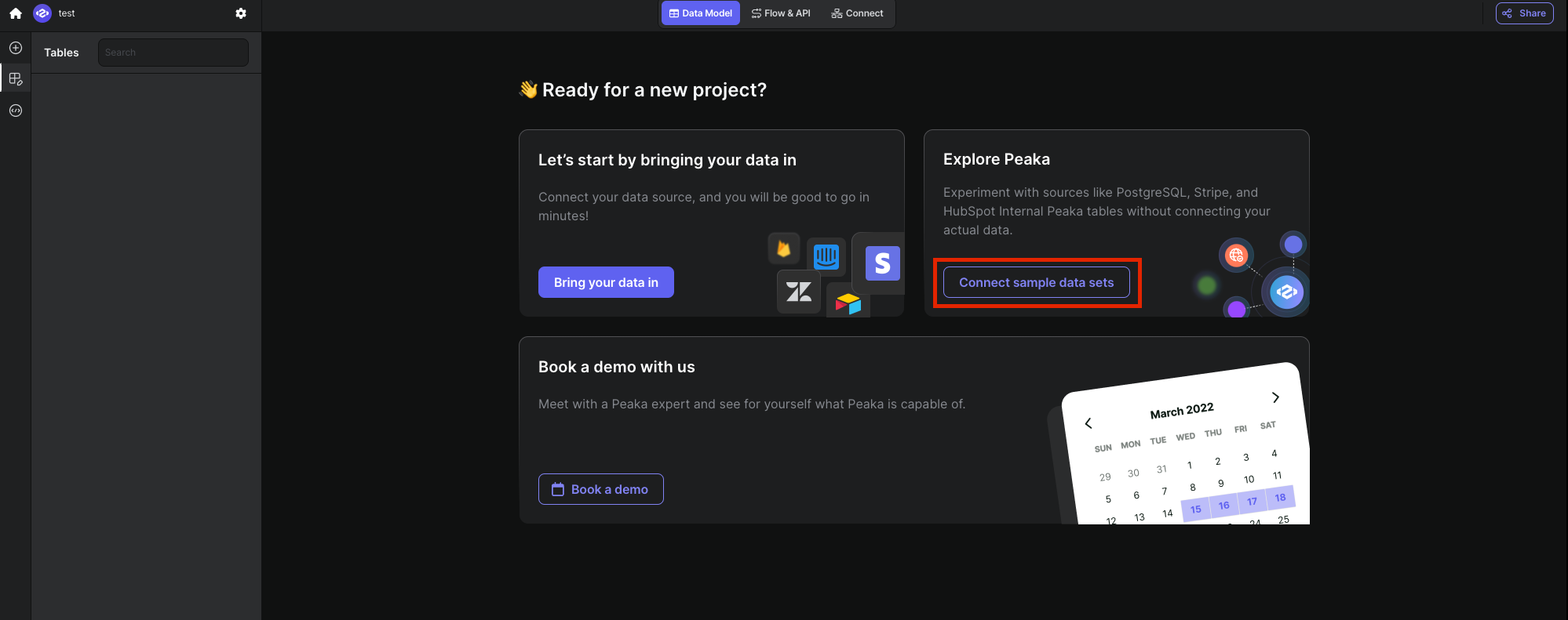 Once you login to Peaka, you need to create your project and connect sample data sets. Checkout Peaka Documentation for creating your Project and follow detailed instructions by clicking here. Enter your created project and click Connect sample data sets button on the screen as shown in the image below: