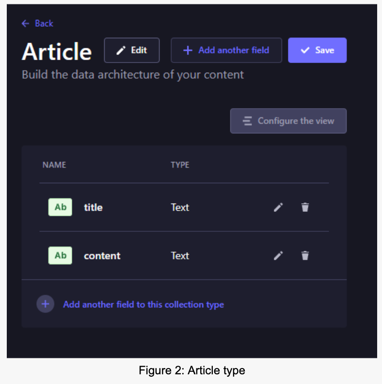 Click the “Create new collection type” link and create a new type. Name it “Article” and add two simple text fields. One field is for short text called “title,” and one for long text called “content.”
