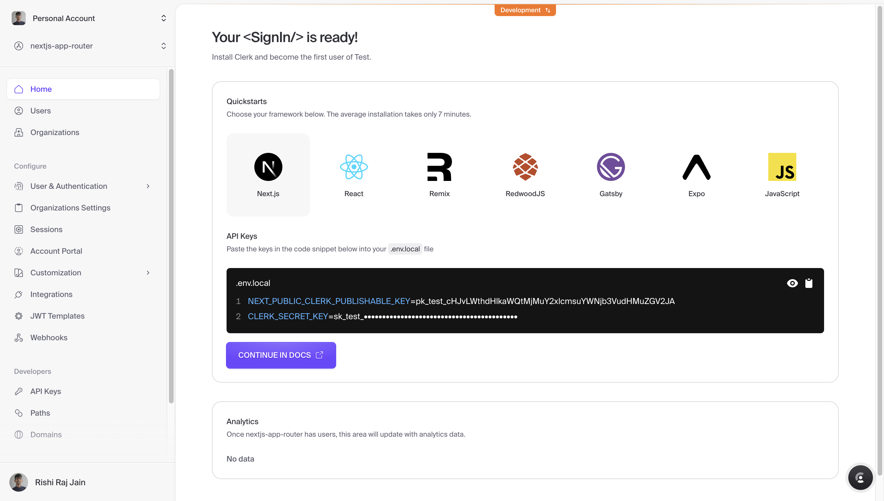 This sets up our Next.js project. Now, let's set up Clerk in the application.