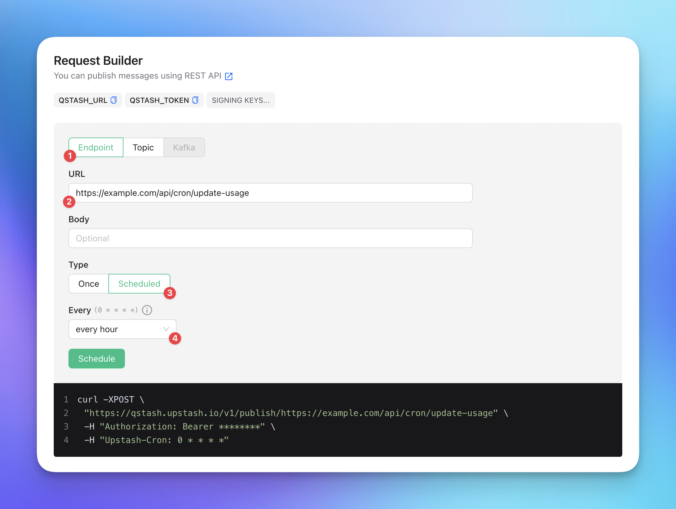 QStash will periodically trigger the CRON job endpoint and update the usage of every user every hour.